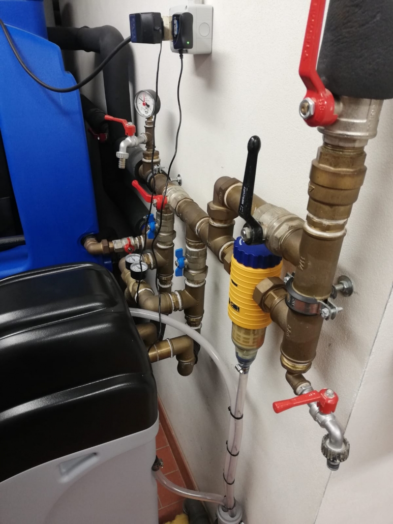 Esempio di installazione di un addolcitore per prevenire la formazione del calcare permettendo così il corretto funzionamento degli elettrodomestici che utilizzano acqua in casa.